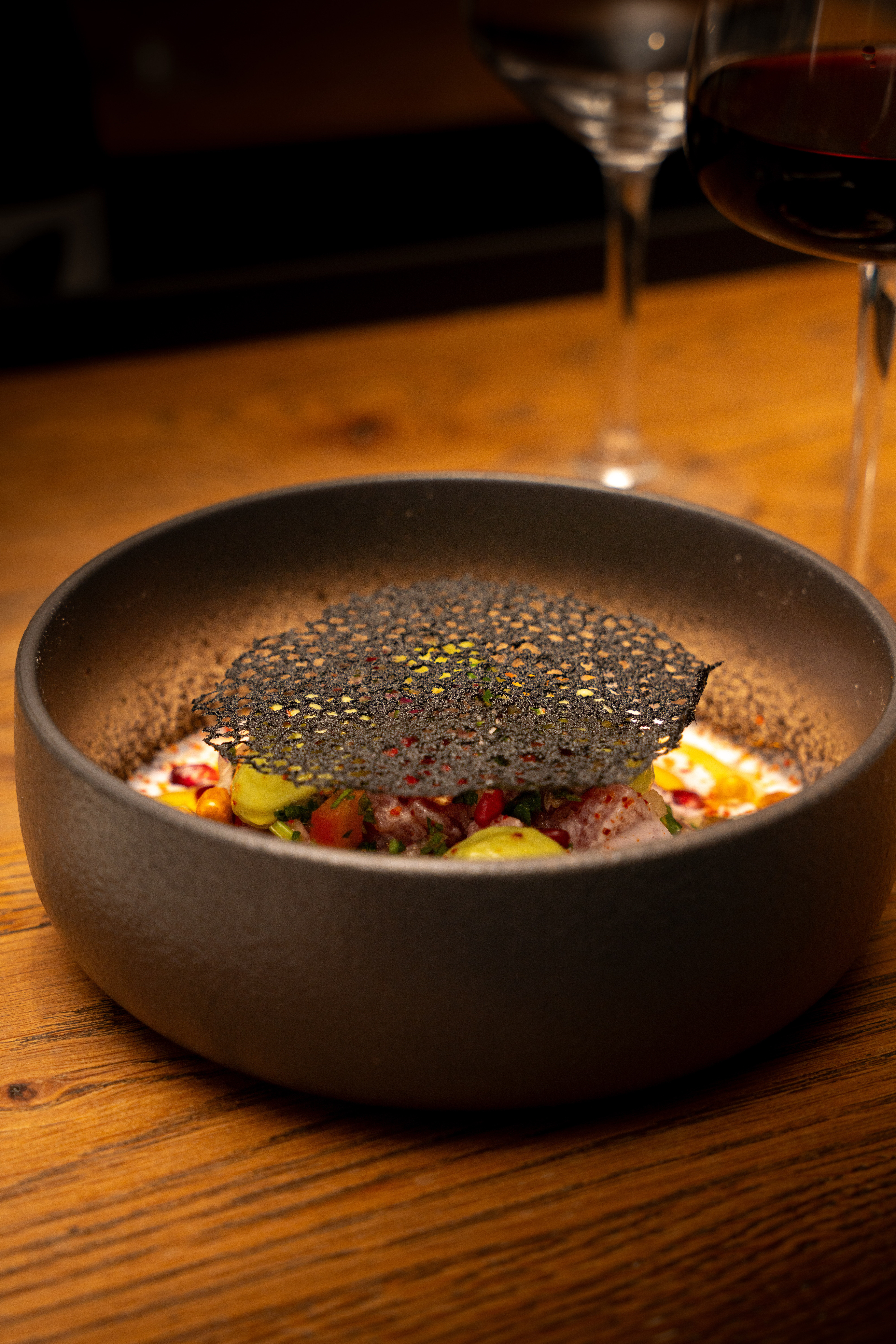 Notre ceviche clásico célèbre la fraîcheur et la précision : un poisson délicatement mariné dans le leche de tigre, relevé d’agrumes et de piments pour un équilibre parfait entre vivacité et finesse. Il est sublimé par notre tuile dentelle à l’encre de seiche, réalisée maison, qui apporte croquant, élégance et caractère. Une assiette signature qui reflète tout notre savoir-faire et notre passion pour les saveurs d’Amérique latine.